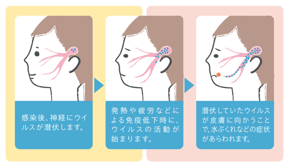 - 日光、ストレス、疲労など『免疫力の低下』が起こると、ウイルスが急に増えて神経に沿って皮膚までやってきて水ぶくれを作ります。